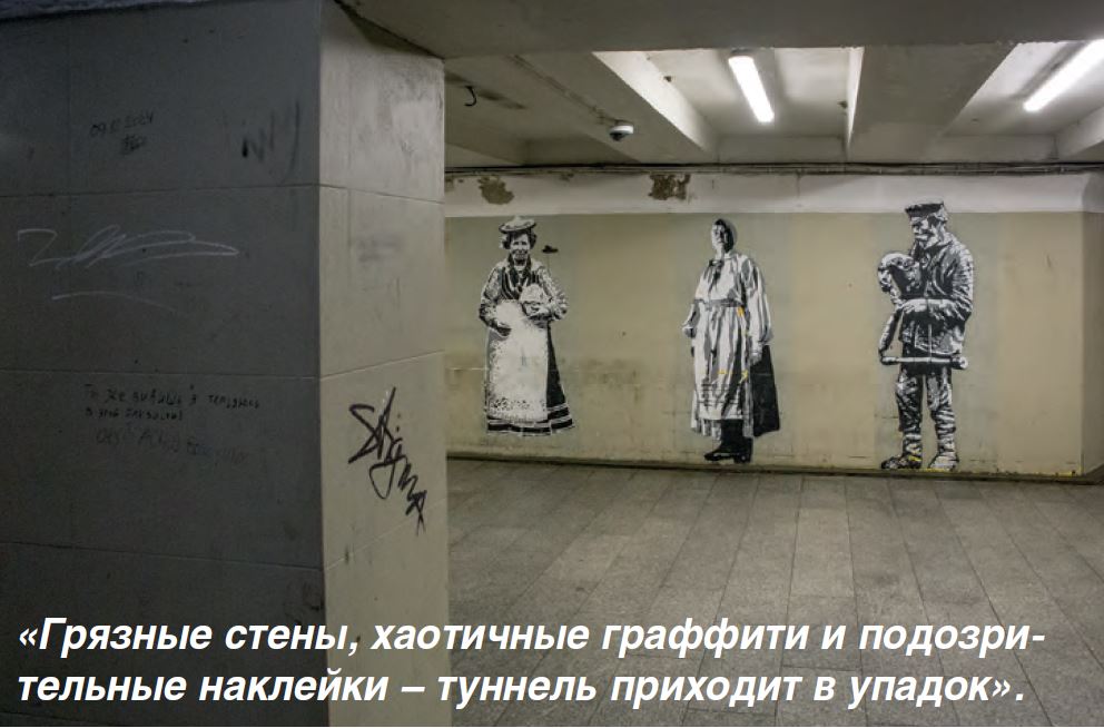 Лия особенно переживает за состояние стен туннеля. Раньше здесь на несколько лет на стене выкупила рекламную площадь компания мобильной связи. Они следили за чистотой и рисовали тематические рисунки. Некоторые картинки остались и сегодня, но рядом уже появляются дурные граффити, в виде подписей и подозрительные наклейки. Типа «хочешь счастья, сосканируй QR код».
