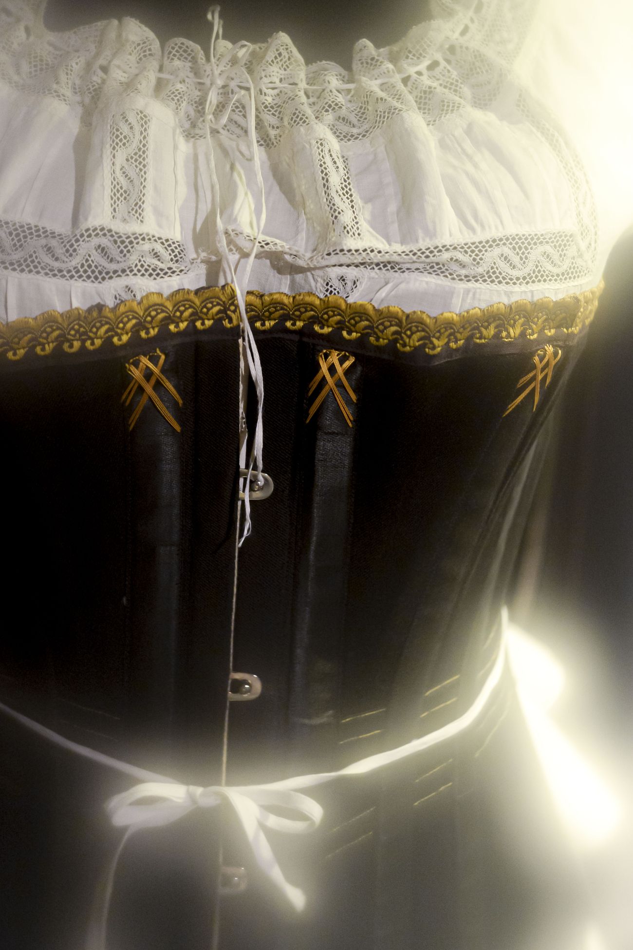 – Посмотрите: здесь на манекене надеты нижняя юбка, панталоны, корсет, кофточка под корсет и кринолин, который держал всю конструкцию. И только сверху надевался корсаж. Разумеется, раздеть женщину впопыхах было невозможно. Ей самой было сложно сходить в туалет. Но замечу, что все панталоны были не сшиты по седалищному шву.