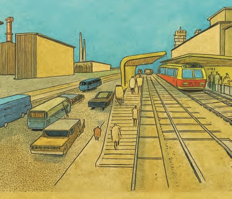 Надземная остановка скоростного трамвая – колоризованная и оригинальная картинка из журнала «Наука и техника», 1965 год.
