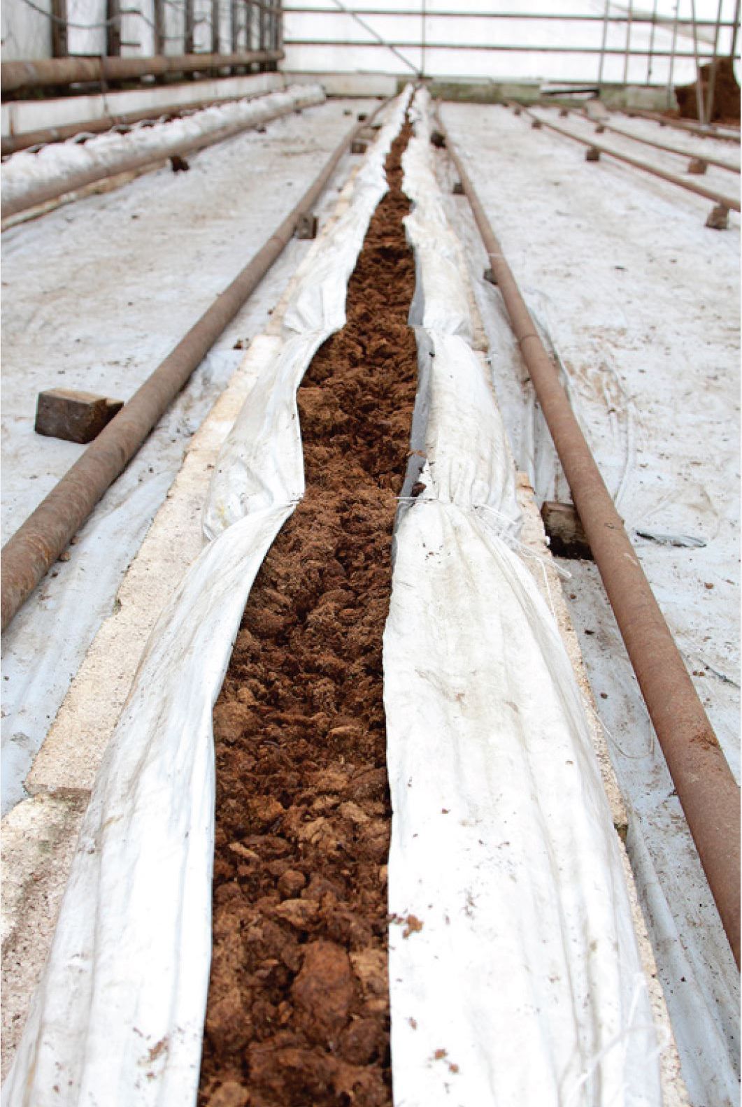 При создании желоба на земле с шагом примерно 80 сантиметров заранее раскладывают веревки, которыми и завязывают пленку с торфом, создавая нечто напоминающее колбасу. Края пленки защищают посадки от сорняков, а верхний зазор между загнутыми вверх краями позволяет растениям жить вполне комфортно. Концы таких желобов можно закрепить скобками или просто завязать веревкой. В желоба можно провести капельный полив.