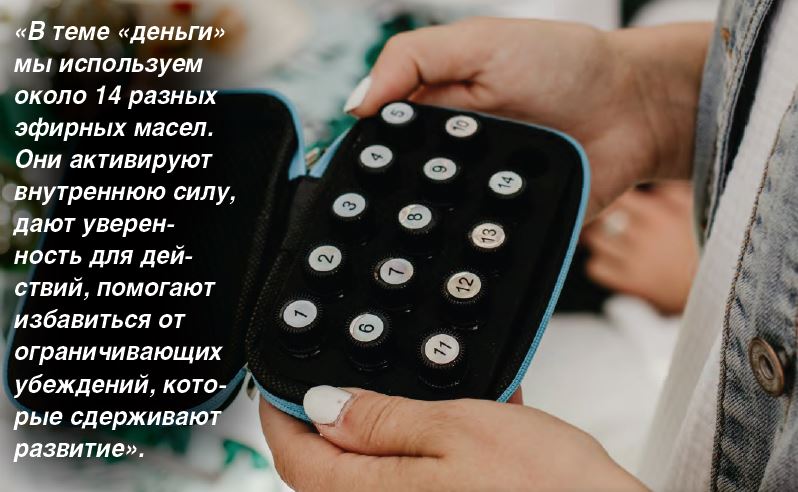 В теме «деньги» мы используем около 14 разных эфирных масел. Они активируют внутреннюю силу, дают уверенность для действий, помогают избавиться от ограничивающих убеждений, которые сдерживают развитие. Ароматы меняют внутреннее состояние – отношение к себе, к деньгам, к собственным возможностям. Это своего рода перенастройка на другой, более благополучный жизненный сценарий.